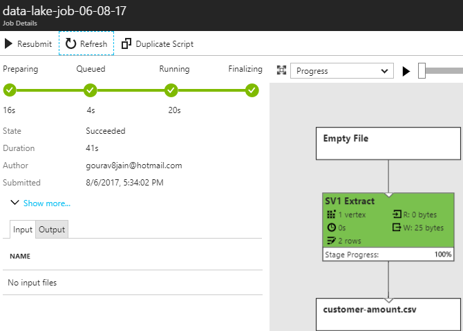 Implementation – Create a U-SQL job and executing U-SQL query on the Data Lake account.