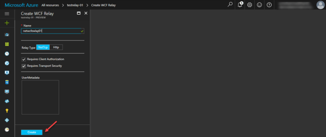 - On click, the "Create" button will create a new WCF Relay under the Relay Namespace.