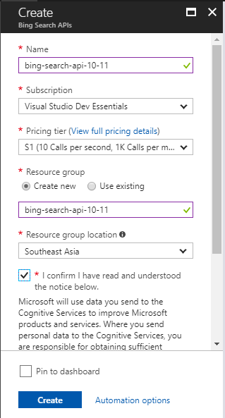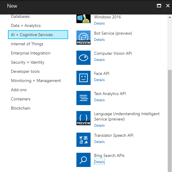 - Open the Azure portal and click on Add. Choose category “AI + Cognitive Services” and then, select an option of “Bing Search API”.