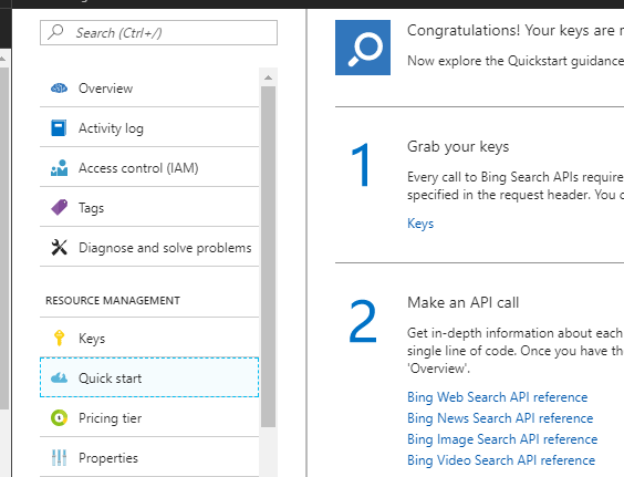 - In the opened section of the Bing Search API, click on the “Quick start" option.