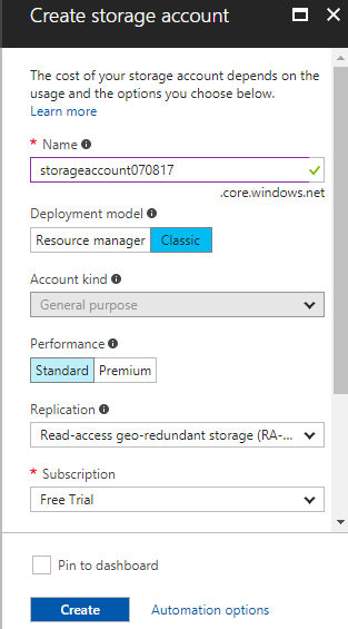 - Fill in all the details and give the storage name. Use the existing resource group and then click on “Create”.