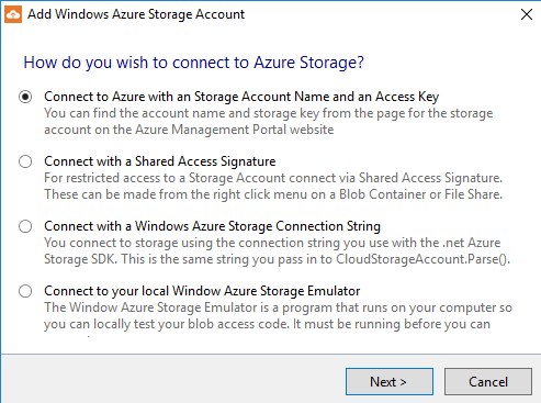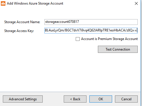 - Go the Azure Explorer; Right click on that and add new connection; Select “Connect to Azure with an Storage Name and an Access Key”.