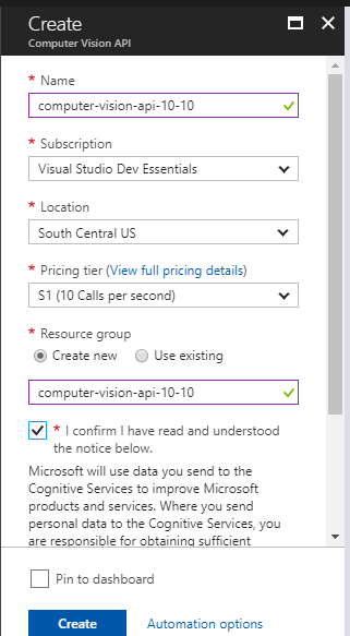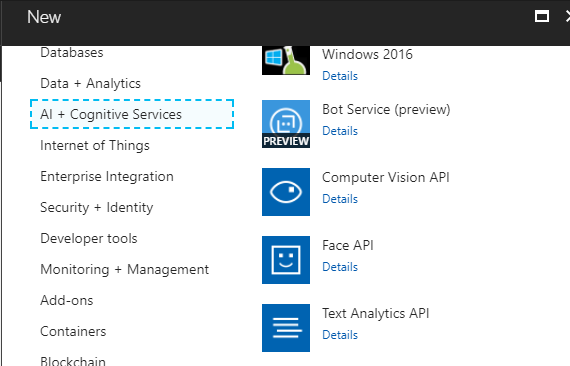 - Open the Azure portal and click on Add, choose category “AI + Cognitive Services”, and then select an option of “Computer Vision API”.