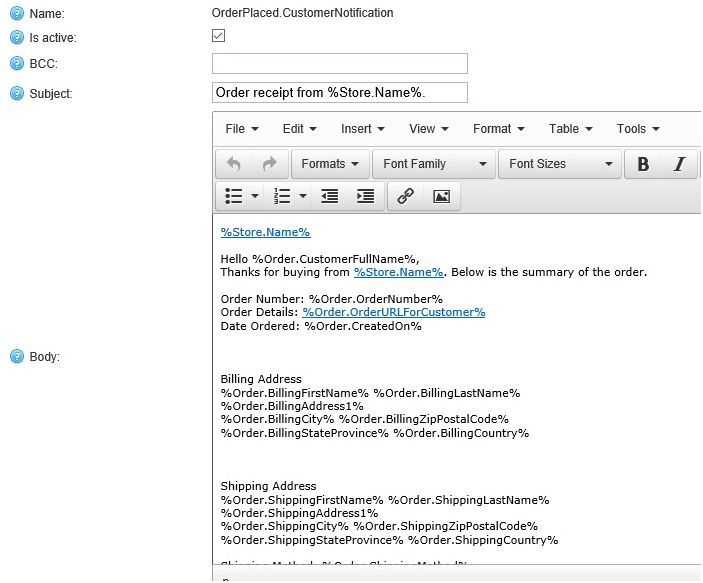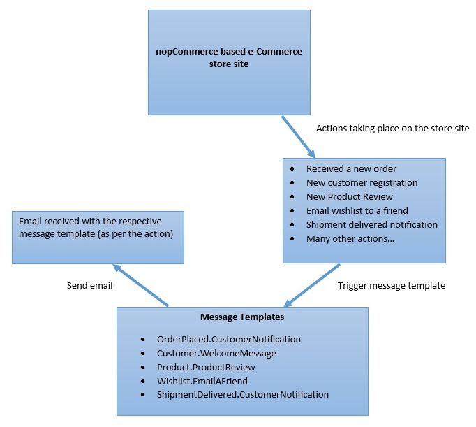 In nopCommerce, message templates are pre-defined email templates (with content) that are being sent from the website automatically based on various actions such as: customer receives the order details in email right after placing an order on the store site, a new customer receives a welcome email right after registration, a customer receives a newsletter subscription activation message in email and much more.