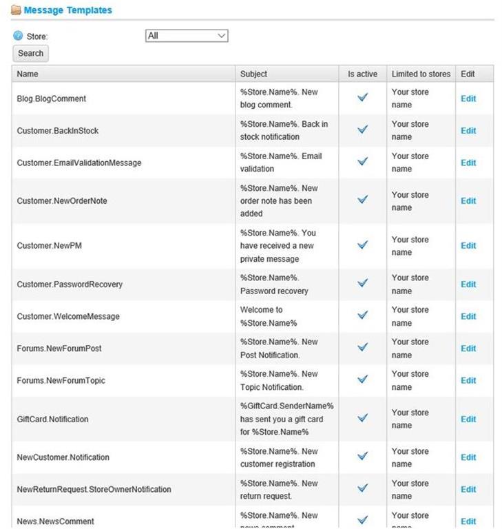 Here, you should be able to see list of all the message templates that come with nopCommerce out of the box: