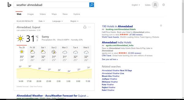 If you send a partial search query to Bing, it will get back a list of suggested queries that other users have searched on the same search topic. In addition to including searches that other users have made, the list may include suggestions, based on user intent. For example, if the query string is "weather in Ahmedabad", the list will include relevant weather suggestions as well.