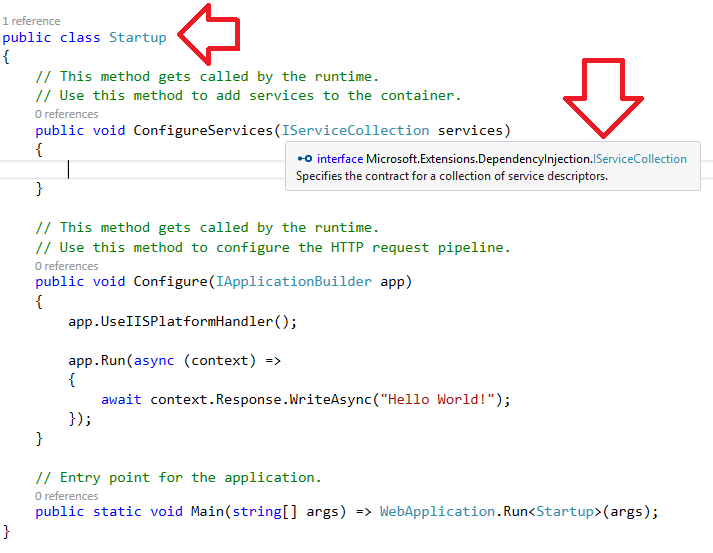 The DNX executes Main, and by convention calls ConfigureServices and Configure methods . The purpose of the ConfigureServices method is to configure dependency injection. Dependency injection in previous versions of .NET was optional. In ASP.NET 5, it is integrated. The dependency injection mechanism depends on an IoC (Inversion of Control) container. Typically when an application starts up, types, like a class, are registered in the container. In dependency injection terms, these types are called services. Once registered, other types can ask the container for an instance of that type. Also, during registration, you can determine what the lifetime should be of that instance.