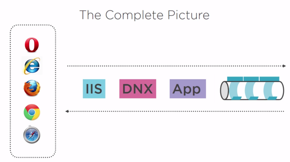 When the request is made, it first arrives at the web server. I will assume that you use IIS for now. IIS then invokes the DNX which will load the CLR and then looks for an entry point, the Main method, in your application and executes it. The main method configures the pipeline by using the Startup class, and the request is pushed through the pipeline, processed by the middlewares which will produce the response.