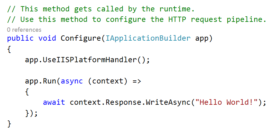 You can see it accepts an interface object of another service called ApplicationBuilder. This object is injected by the dependency injector. The Configure method configures the HTTP request pipeline of ASP.NET. The pipeline specifies how the application should respond to HTTP requests. When your application receives a request from the browser, the request goes through the pipeline and back.
