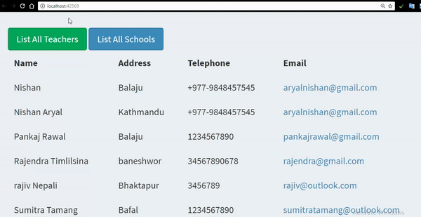 Now click on List All Teachers and List All Schools and you will be able to enjoy data retrieval with our page refresh. Note: We are invoking Partial Views here using JQuery Unobtrusive Ajax.