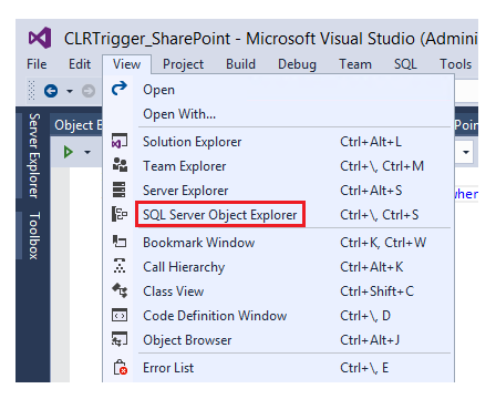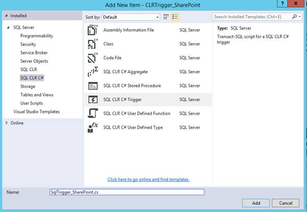 Right click the solution and add a new item – SQL CLR C# Trigger.