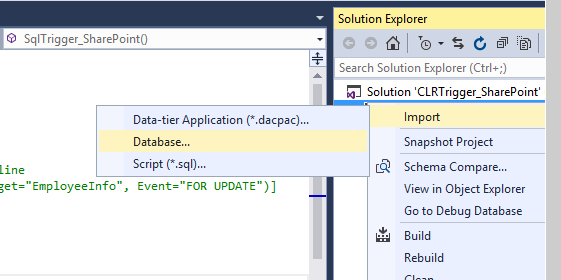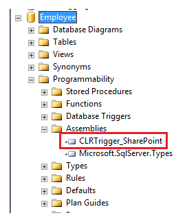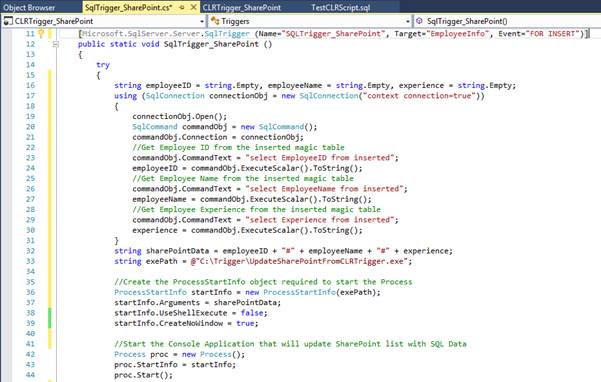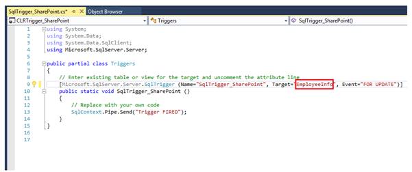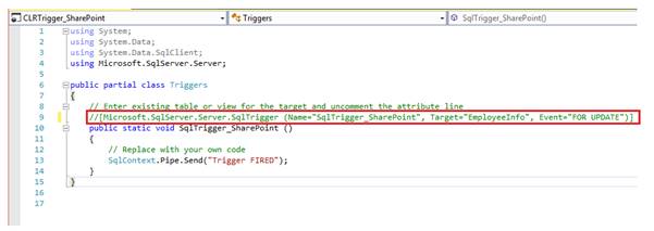 - [Microsoft.SqlServer.Server.SqlTrigger (Name="SQLTrigger_SharePoint", Target="EmployeeInfo", Event="FOR INSERT")]