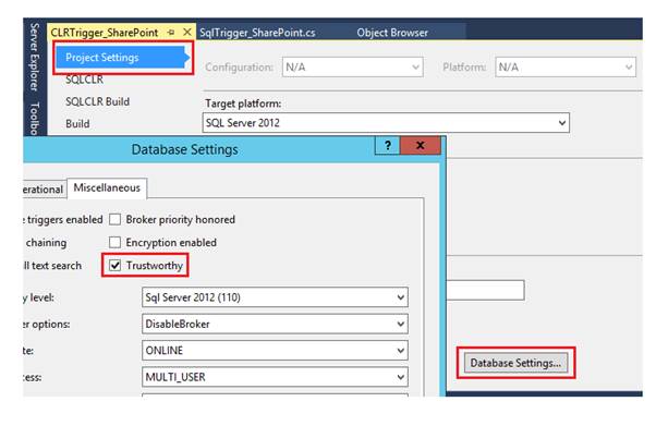 In the same Window from the database settings, select the ‘Trustworthy’ Check box.