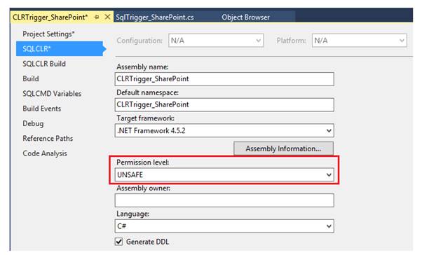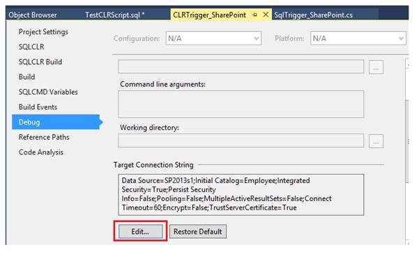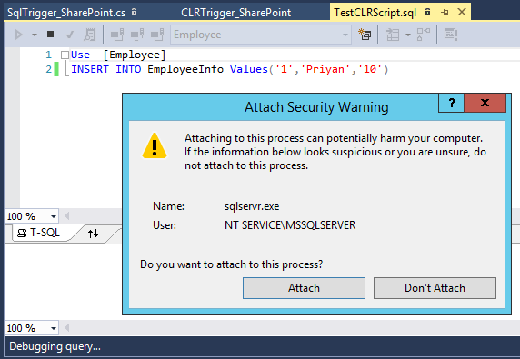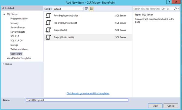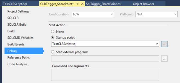 Once we have completed the creation of CLR trigger, we can debug the trigger with a bit of configurations, as discussed below. We will add a SQL script file, which will contain the T-SQL statements that will invoke the trigger.