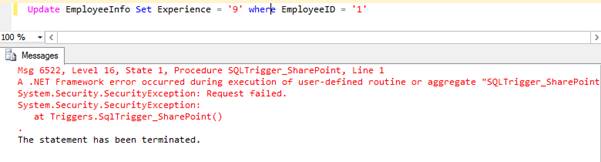 Thus, we have seen how to make use of a SQL CLR Trigger and SharePoint Client Object Model to update SQL Server table data to SharePoint synchronously.