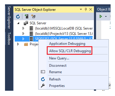 From SQL Server Object Explorer, right click SQL Server instance and select ‘Allow SQL/CLR Debugging’.