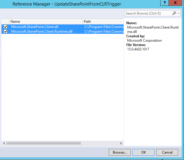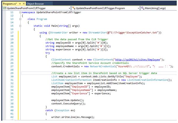- The Console Application is invoked from the CLR Trigger. It will retrieve the inserted values as command line arguments and use SharePoint Client Side Object Model library to update SharePoint list.