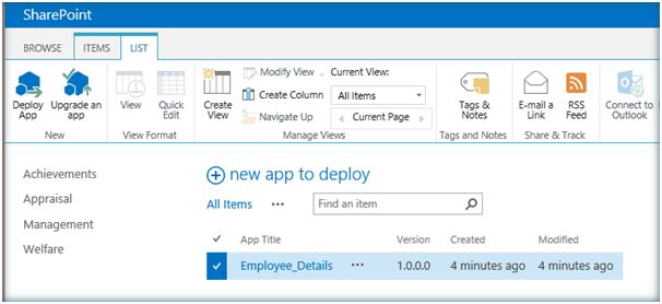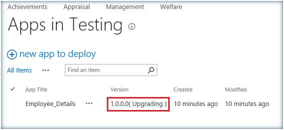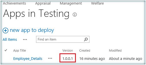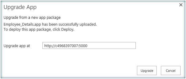 However Share Point hosted Apps come with a design issue. Redeployment of Share Point hosted app causes the data to be lost .Say I have a list named Employee which is deployed as a Share Point Hosted App. Now I populate the list with data and after some time if I redeploy the App all the data within the list will be lost. It is here Share Point App Upgrade comes into play. Share Point App upgrade facilitates updating an already deployed app with the latest changes. So if the Employee List with Content Type and Site columns is deployed as a Share Point Hosted App and if I have to add an additional column to the list after a deployment we can achieve this without a second deployment. Let’s see how we can achieve this. In addition to the above columns I am planning to add an additional column, Previous Company, to the site columns and List. In order to do that let's open the existing app solution and add the new column to the site columns xml. Add the new column to the content type, if necessary. Add the column to the List as well. Go to App Manifest.xml. Increment the version each time a new upgrade happens. Right click the project and Publish. Click on Package the app. It will open up the .app solution location. Copy the local file URL. Now go to the site and Navigate to the App “Apps in testing”. If you don’t find this in Site Contents,it’s because the developer feature is not enabled. If so enable the developer feature as below: Enable-SPFeature e374875e-06b6-11e0-b0fa-57f5dfd72085 –urlhttp://c4968397007:5000/ e374875e-06b6-11e0-b0fa-57f5dfd72085 is the id of the developer feature . Now we can see Apps in Testing. Click on Apps in Testing and let’s upgrade the app. Click on Upgrade an app. Input the local .app file url which was saved earlier. Click on Upgrade. The upgrade process has started. It will take some time to complete the upgrade process. Once the upgrade is completed the app will be updated with the incremented version number. Let’s go to the list and see the new site column added. Thus we have seen how to upgrade the app without redeploying. Upgrade process retains the data within the list, this is one problem associated with app deployment as each deployment installs a fresh app causing existing data loss. However any form changes (New Form/Edit Form) cannot be pushed into the existing app via upgrade process. Form changes will need a fresh deployment which is a limitation by design.