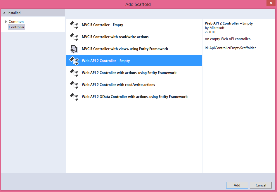 The first step is to create a new project with a WEB API template. Add an Empty controller to the project and name it "