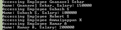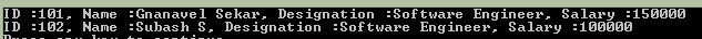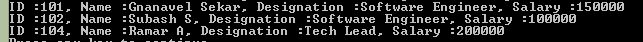 - Console.WriteLine("ID :" + item.ID + ", Name :" + item.Name + ", Designation :" + item.Designation + ", Salary :" + item.Salary);