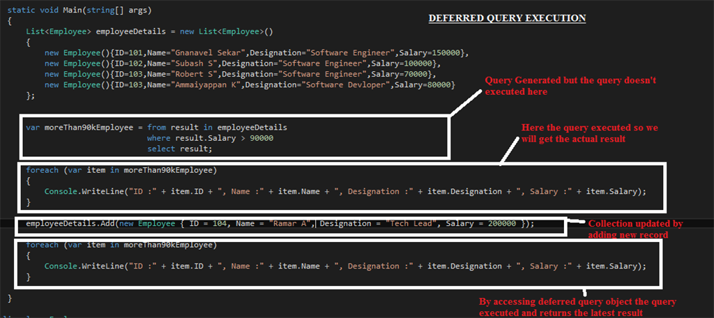 In above result we can realize that as the extension method method executed for each time when the respective(employeeMoreThan90ks) deferred query is executed, EmployeeMoreThan90k() is getting called when you iterate employeedetails using the foreach loop.This way we can create custom methods using the yield keyword to get the advantage of deferred execution.Deferred execution is important as it gives you the flexibility of constructing the query in several steps by separating query construction from query execution.