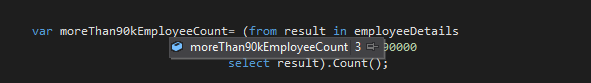 - var moreThan90kEmployeeCount = (from result in employeeDetails where result.Salary > 90000 select result).Count();