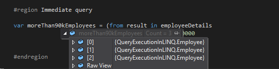 Same query I am writing here to get the employees who are more than 90k salary, here we can use the conversion operator(ToList(),ToArray(),etc) to get the immediate result, not only with conversion operator we can get the immediate result by using all aggregate function also.