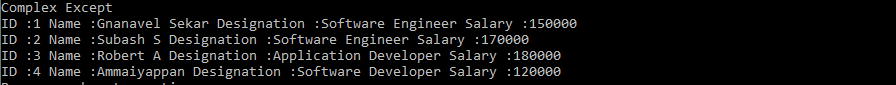 - ID = 1, Name = "Gnanavel Sekar", Designation = "Software Engineer", Salary = 150000