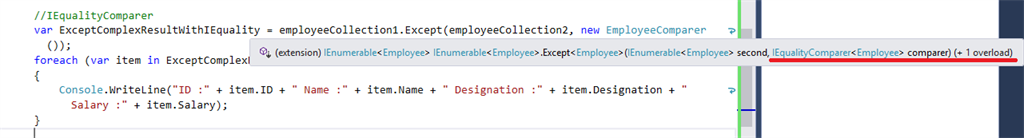 - var intersectEqualityComplexResult = employeeCollection1.Intersect(employeeCollection2,new EmployeeComparer());