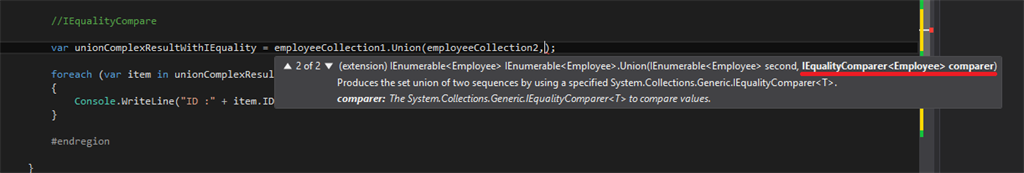 - var unionComplexResultWithIEquality = employeeCollection1.Union(employeeCollection2, new EmployeeComparer());