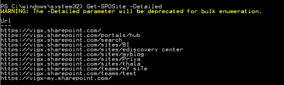 This command will give a detailed list of all the site collections in your SharePoint Online tenant, as shown in the screenshot below.