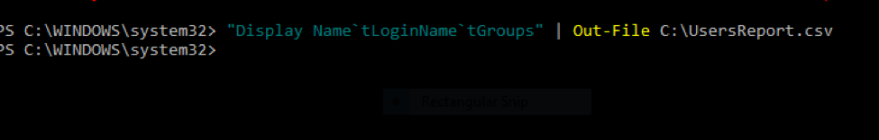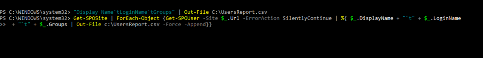"Display Name`tLoginName`tGroups" | Out-File C:\UsersReport.csv
