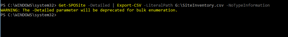 Get-SPOSite -Detailed | Export-CSV -LiteralPath G:\SiteInventory.csv -NoTypeInformation
