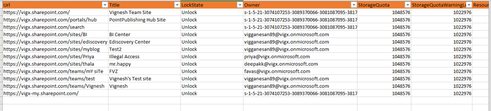 8. To create an inventory of all the SharePoint site collections in your Tenant which has the information of the Site Name, URL, Quota, compatibility level, and other information. And, export the results to a CSV file.