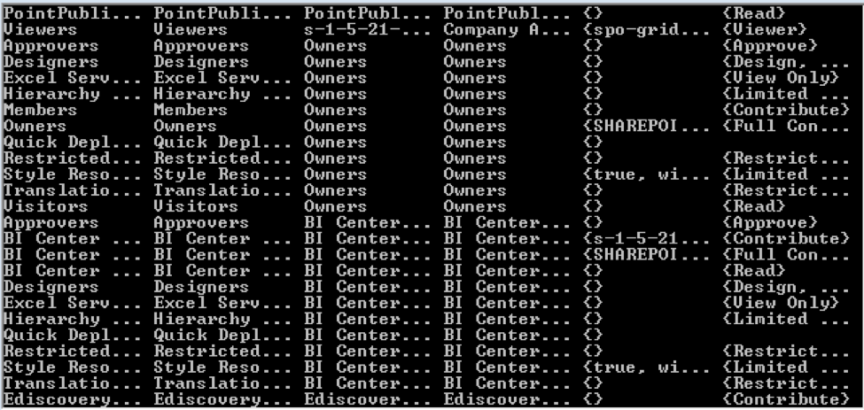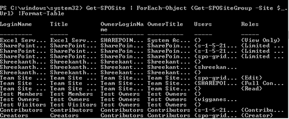 Running this command will generate the results, as shown in the image below. Also, please note that this command will display the default SharePoint groups as well as the custom SharePoint groups that were created manually.