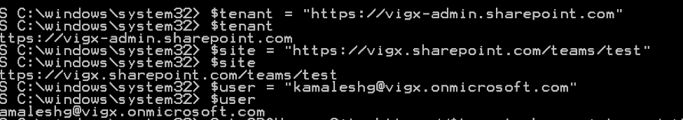 $tenant = “https://vigx-admin.sharepoint.com “--> This would be my tenant URL.