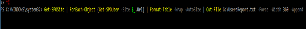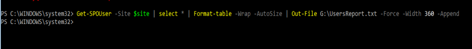 Get-SPOSite | ForEach-Object {Get-SPOUser -Site $_.Url} | Format-Table -Wrap -AutoSize | Out-File G:\UsersReport.txt -Force -Width 360 -Append