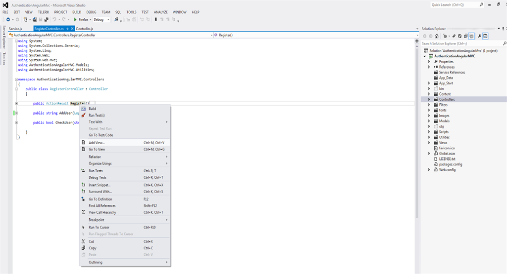 - Go to the RegisterController ,right click on the Register Action, select AddView option.