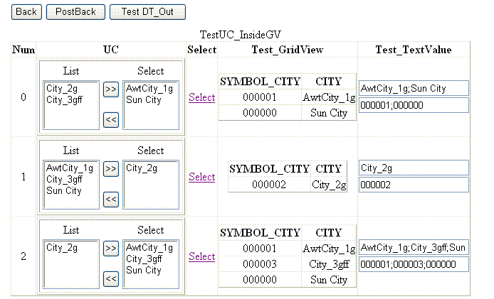 The fourth column is the TemplateField and contains GridView control with Id = "GridView_Inside", which allows to display the C_DataOut property of the ListBoxesFT_C2 for selected row; the HeaderText property of this column is "Test_GridView".