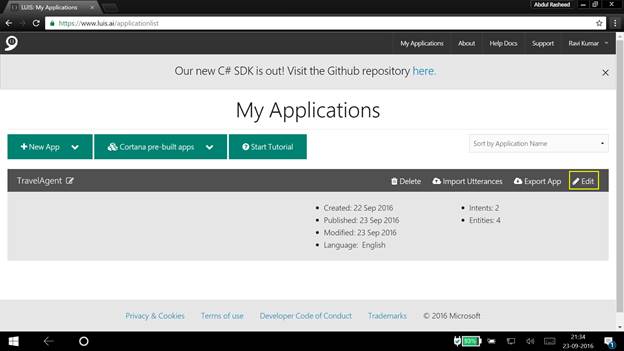 Follow the below steps now, Step 1 - Log into LUIS API web page from your web browser – www.luis.ai and click on Edit for the Application that we have developed already. You will be getting the below screen now. Step 2 - Let's work with Action Binding, this is an important feature of LUIS. LUIS supports only one action per intent and this action can include a group of parameters derived from entities. Defining an action - Click on “BookFlight” intent at the left pane under Intents. Select “+Add Action” Click on “Add Parameter” Now, fill the below details for the parameter. You should add three parameters here as “FromLocation”, “ToLocation” and “Date”. Check in the Required button – Name as FromLocation – Type as Location::FromLocation and click on Save. Repeat the same for other two parameters of ToLocation and Date followed by a click on Save button. You can use the trash button to delete a parameter. Now, at the previous screen, you can find multiple action parameters have been added for the intent named “BookFlight”. Follow my next article to use Microsoft Azure Subscription for Microsoft Cognitive Services.