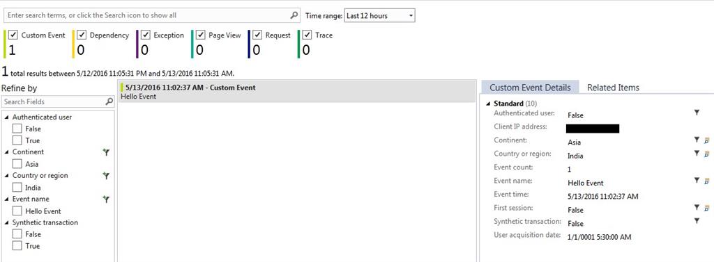 Hello event will be logged to the Applications insights. You can see the logged data either by going to Azure portal or in VS 2015.