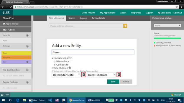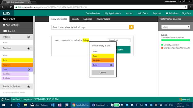 Step 3 - Let's label the Composite Entities now. We know that the Composite Entities can work either individually or even with Combined Entities, and now we will be labeling it. Let's create a new Utterance now as “Search news about India for 2 days”.
