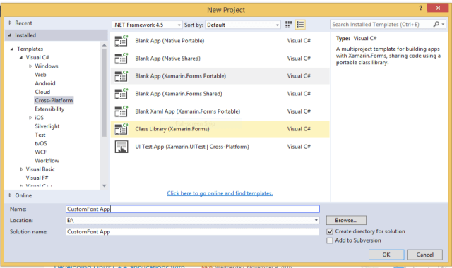 Select "Cross-Platform" at the left side and then select Blank App (Xamarin.Forms Portable), as shown in the figure.