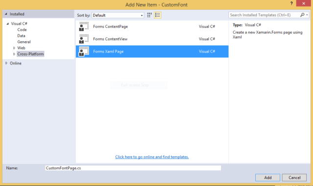 Select Cross-platform and select "Forms Xaml Page" and rename the page as "CustomFontPage".