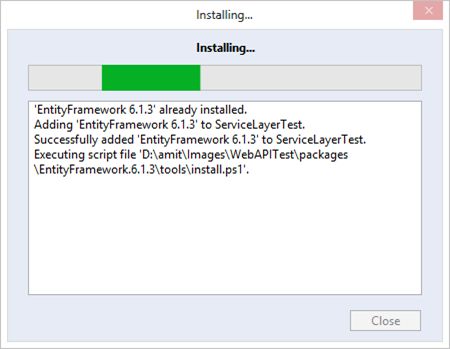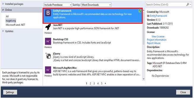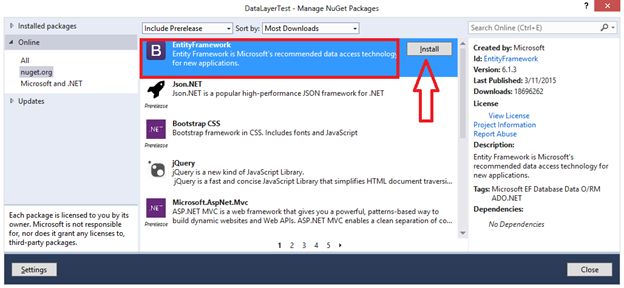 Here, I have the entity framework. If you don’t find it easily, you can searc for it from the top right search box. Click the install button to install it.