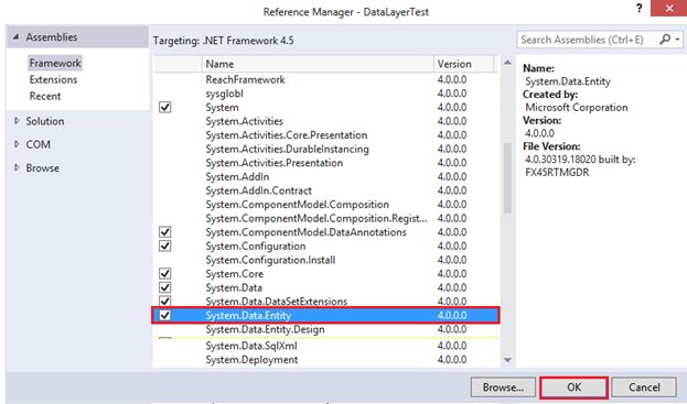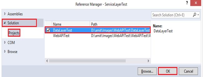 Scroll the solution and select the projects. You’ll find DataLayerTest project. Check it and add it to the Service Layer by hitting OK button.