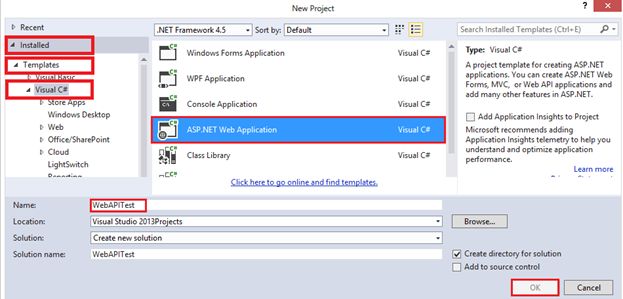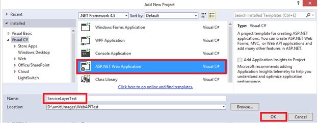 Expand Installed => Templates => Visual C# and choose an ASP.NET Web Application from the menu, give a name to your Web API project with which you want to do work and finally click “OK” button.