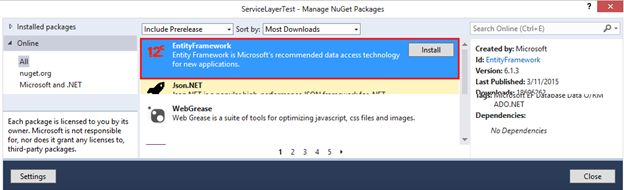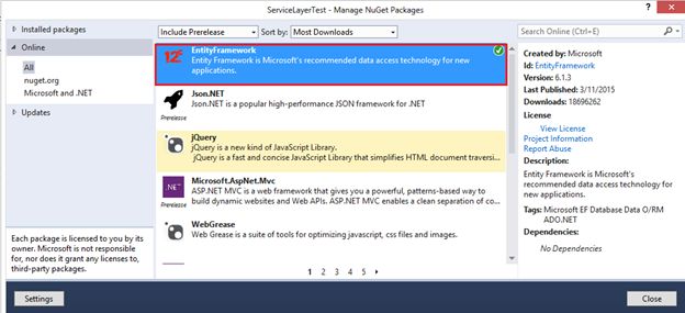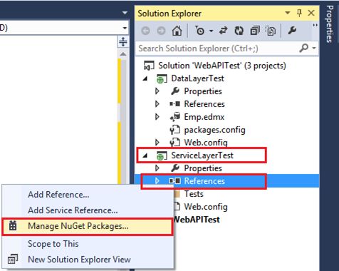 Afterwards, I need to add an entity framework from NugGet Package Manger in the ServiceLayerTest project. Right click the references and add NuGet.