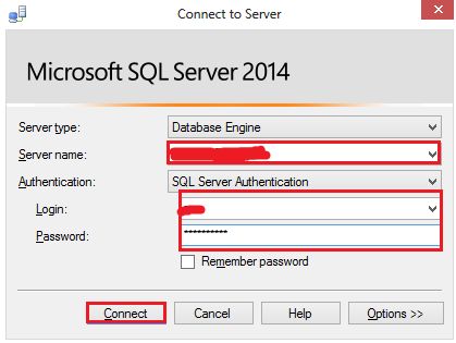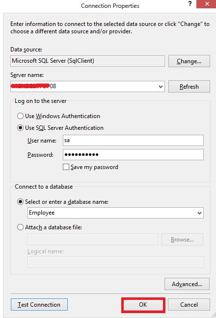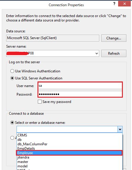 After selecting the Server name, the database can be accessible, give authentication detail and select a database which you’ve created.