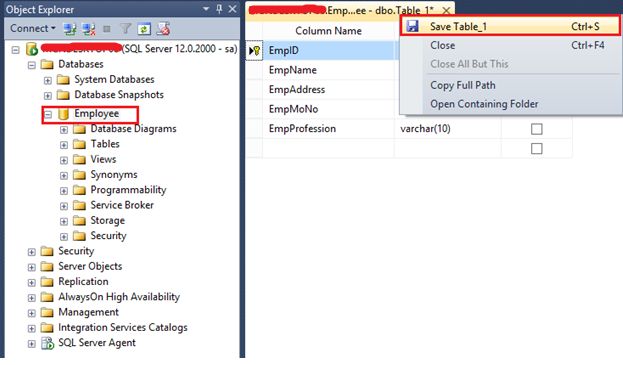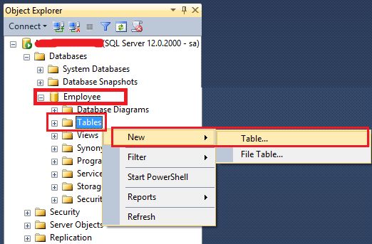 In the database, we need to create a table so right click on the tables under your database and create a table.